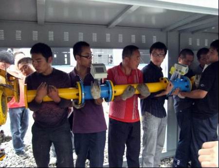 先是將以前的調壓柜拆掉,雖然安裝調壓柜的地方都是軟泥,但是大家已經顧不得臟了,你扛我抬,僅用了十幾分鐘的時間就完成了全部拆卸。然后是搬運到新地點重新安裝,按照圖紙的設計,大家在黃耀武經理的指揮下,對調壓柜內部的零件進行了重新拼裝。擰螺絲的擰螺絲,遞工具的遞工具,每個人都在認真地干著自己的工作。雖然頭上淋著小雨,鞋底沾滿泥濘,但是大家的工作熱情卻依舊高漲,為了用戶的用氣安全,擰緊每一個螺栓,放正每一個墊片……大家的臉上滿是水珠,已經分不清是雨水還是汗水,為了盡快完成改裝,不耽誤用戶的生產用氣,工作一直持續(xù)到將近下午一點鐘,雖然大家都是又熱又累,但是看著自己的勞動成果,大家都發(fā)自內心地笑了。
