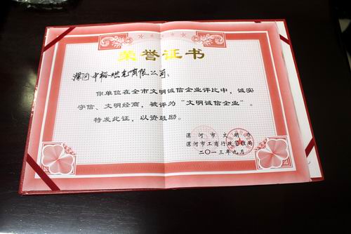 榮獲“文明誠信企業(yè)”榮譽稱號