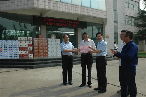 李小會(huì)董事長(zhǎng)代表公司接受趙永貴主任(左三)發(fā)放慰問(wèn)品